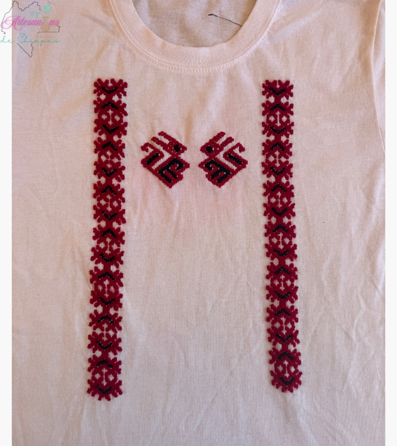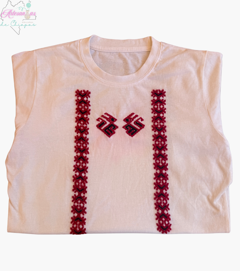 La sencillez del estilo, se combina con un bordado muy llamativo que destaca por su color rojo vibrante sobre el fondo blanco de la tela. Este contraste hace que el diseño de esta blusa sea elegante y único, ideal para quienes aprecian la artesanía y los detalles hechos con amor.